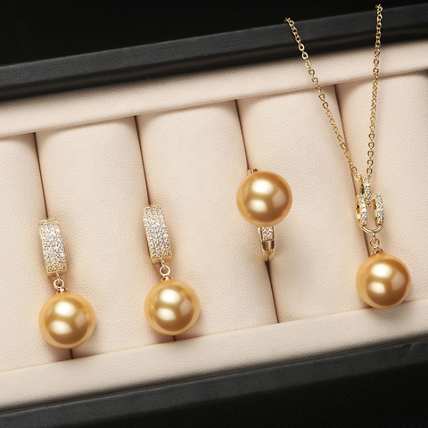 Fashion Jewelry Sets 18K Gold Plated Brass Stainless Steel Zircon Large Round Pearl Pendant Necklace Earrings Ring Sets Women